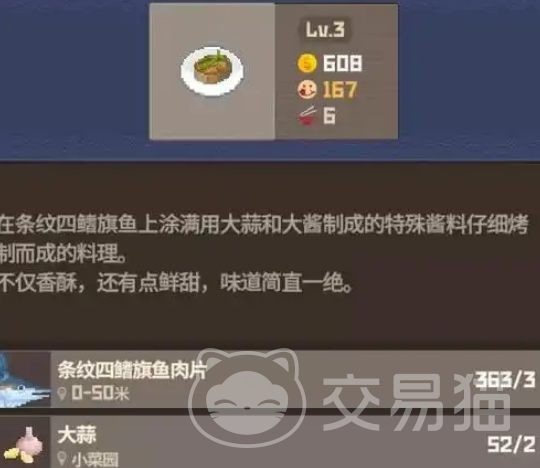 其中大梭鱼饼,以大梭鱼为主要材料,每次制作时都要消耗5片大梭鱼,但是却只能制作出4盘料理,料理的整个售卖价格会比较昂贵。