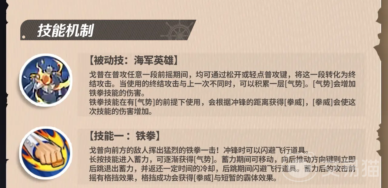 戈普被动技能海军英雄,当其打出普攻前摇之后,再次释放普攻,将这段攻击变为终结技。它终结技触发气势,进而提升铁拳攻击的伤害。