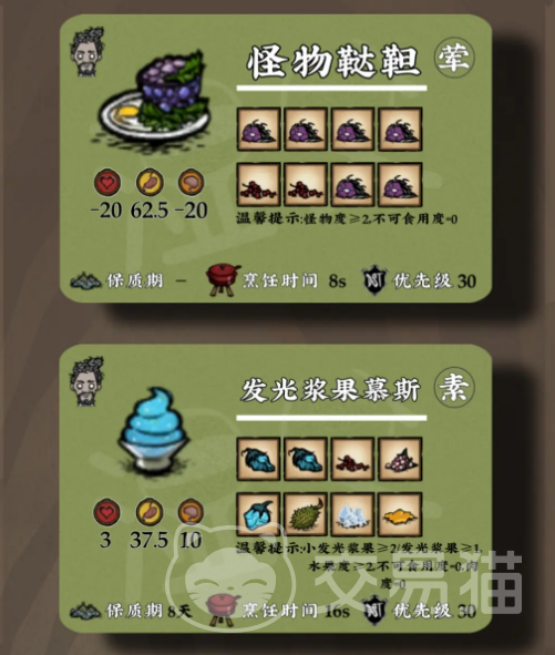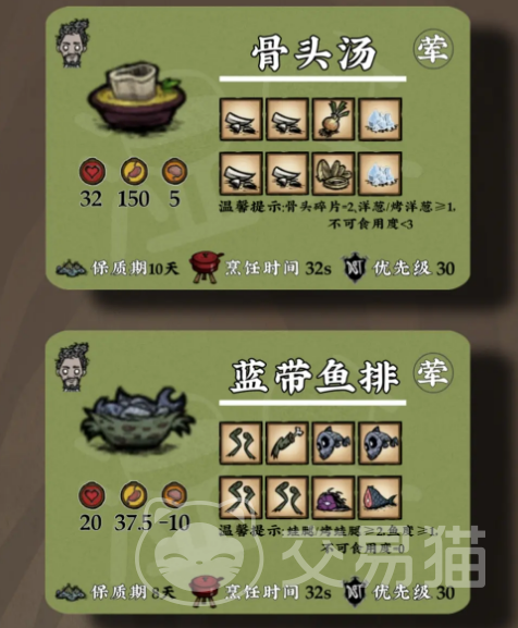 骨头汤能够恢复个人生命值40秒优先度为30.对于肉食爱好者来说非常适合。鲜果可丽饼以及海鲜杂烩这两种特色菜也能够恢复个人的生命值40秒。发光浆果慕斯这是一道甜点,能够散发出非常健康的光彩,非常适合在黑暗的环境下使用。
