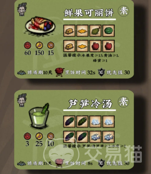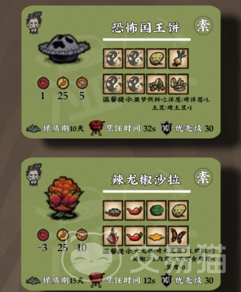 大厨特色菜包含10个,比如芦笋冷汤能够降低体温,在炎热的夏天食用避免中暑。辣龙椒沙拉能够让你的身体变暖与芦笋冷汤形成鲜明对比,非常适合在寒冷的天气使用,需要15天才能喷。蓬松土豆蛋奶酥能够让你的生命值恢复40秒,优先度为30。