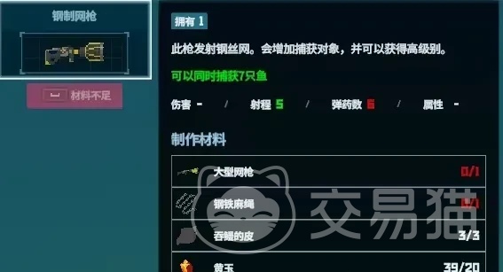 这种钢制的网枪非常强大的,如果玩家们想要获得也是非常有难度的,在使用时可以同时抓捕七只鱼,射程的速度也有五米远,零且一共拥有六发子弹,大家可以一次性使用六次来抓捕鱼类,机会还是非常多的,但是需要通过3400个金币才可以兑换,还可以通过稀有材料来进行制作,需要利用三张吞鳗的皮,这个材料是非常稀有的,玩家们在前期可以先将材料全部收集完成。