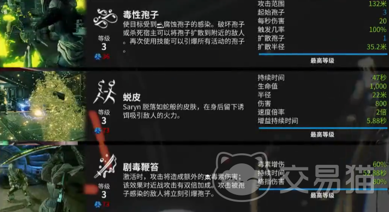 剧毒鞭笞,在激活的时候攻击会对敌人造成额外的毒素伤害,近战攻击的话则是双倍加成,被孢子感染的敌人受到该攻击会立刻引爆孢子。最后的“瘴气”,则可以释放毒气,范围毒伤,已经受到孢子感染的敌人会受到更深的感染。