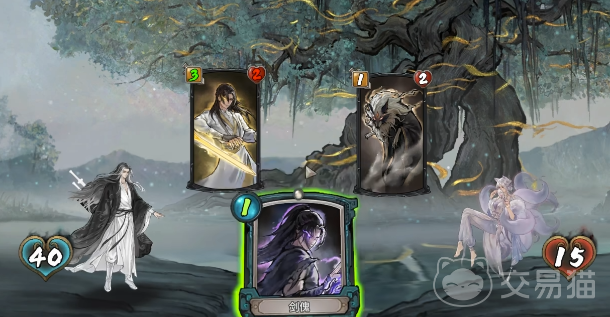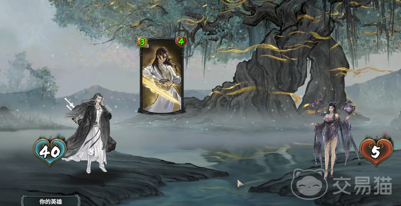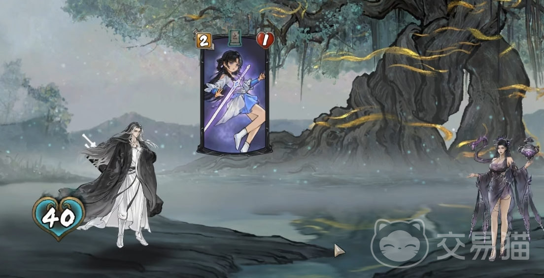 在进入游戏之后咱们会遇到一个渔翁,他会先让咱们进行一些试炼。这个就是属于教学关卡,咱们首先需要先选好自己想要的卡牌,在选择完毕后便会来到对战界面,咱们的初始生命值有40点,而我们的对手则是炼丹师素素,她的生命值只有10点。一开始咱们第一回合获取到一张名为小剑士的随从牌,他的效果是随机获取到一张招式牌,每一个随从都是有着生命值和攻击力的,他的攻击力是2点,生命值则是1点。