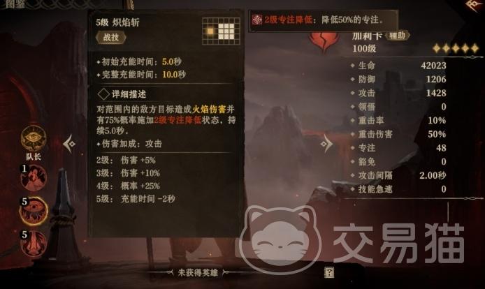 炽焰斩是加莉卡的一项主动技能,能够对周围的敌人造成火焰伤害,并有机会施加一个持续5秒的专注降低状态。这不仅可以作为输出伤害的手段,还能减缓敌人的技能使用频率,从而打乱敌人的节奏,为团队带来一定的优势。