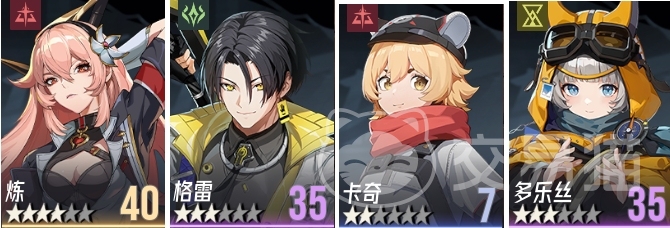 首先是由格雷、炼、卡奇和多乐丝这四位角色组成的队伍,这四个角色在游戏中属于新手赠送,所以获取难度较低,非常适合新手玩家初期使用,在这支队伍里,炼和格雷充当主C和副C的角色,他们拥有极为出色的输出能力,能够在战斗中对敌人造成可观的伤害,卡奇则主要负责拉条辅助工作,他可以加速队伍的行动条。