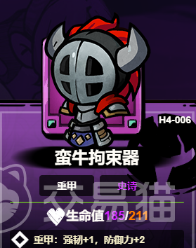 【额度者面具】这个装备的话,是目前游戏中比较流行的中毒玩法首选的护甲之一,作为轻甲十分的便捷,不经可以增加生命值和法力值,同时在本体周围会生成一个带有毒素的效果范围。中甲提供适中的防御力,同时附加一些提升攻击力,暴击率或生命值的属性,是大多数玩家的首选。以高防御力著称,适合需要承受大量伤害的坦克和近战角色。重甲提供高额的防御力,但会降低角色的移动速度和灵活性。对于需要在战斗中吸引敌人火力,保护队友的玩家来说,重甲是不可或缺的选择。【蛮牛拘束器】这个是一个安全感满满的重甲,主属性的生命值,可以大幅度提高生命上限。