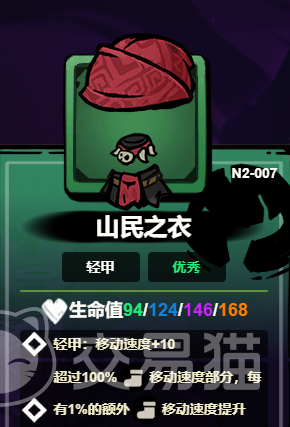 前期如果大家没有办法去获得较为高阶的外观,那么可以选择使用【山民之衣】,这是一个绿色品质的衣服,这件衣服的外观是卡通风格,它主要由红色和黑色组成,设计简洁而富有活力。衣服的主体部分采用红色,这种鲜艳的颜色为整件服装增添了活力和热情。同时,黑色作为辅助色,在细节上进行了点缀,增加了服装的层次感和时尚感。最重要的是,这个套装可以增加10点移动速度,而且作为轻甲中性价比较高的一款,还是很值得各位去进行携带的,当移动速度超过了本体移动上线,可以增加0.5的暴击效果。