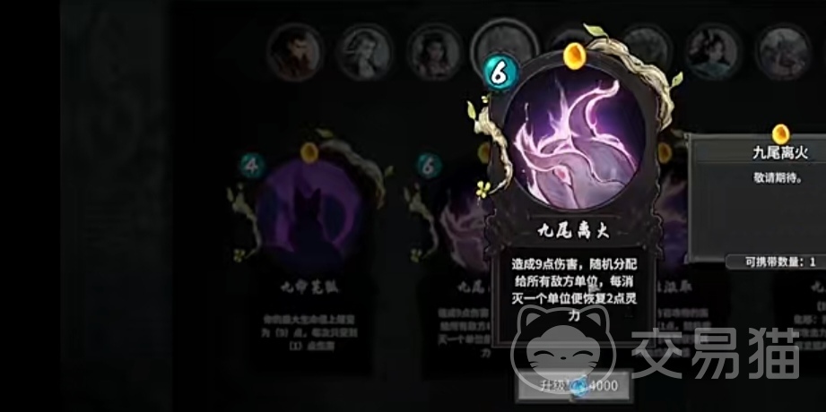 上古河图狐狸的本命卡牌除了这四张卡牌以外,还有混乱思维、群狐夜袭、精神控制等,狐狸的本命卡牌虽然能力各不相同,可是有四张卡牌确是必带的,小编也推荐大家携带九尾离火、属性汲取、九尾妖狐以及精神控制。