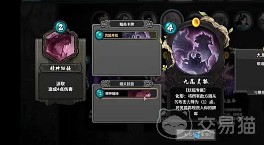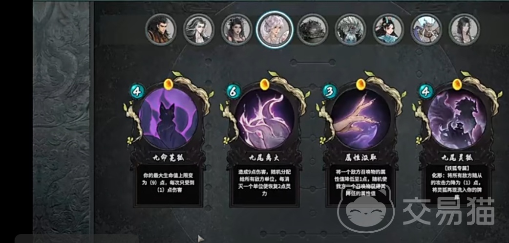 第四张卡牌九尾灵狐,九尾灵狐是狐狸的化形卡牌,这张卡牌可以汲取造成4点伤害,九尾灵狐搭配上九尾芜狐就会变得非常的伤,因为这两张卡牌配在一起用,就相当于在一回合内,敌人打你的次数都被抵消了。