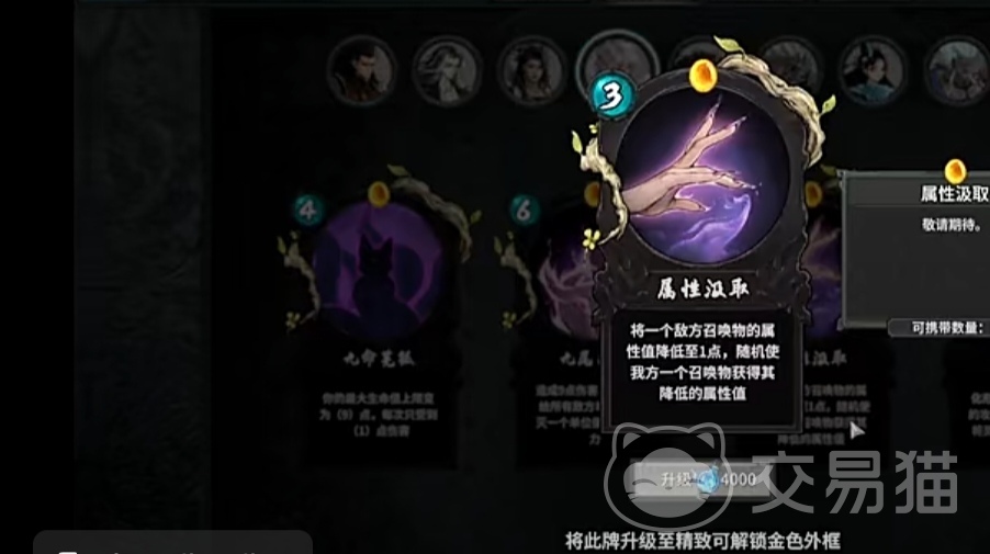 第三张卡牌叫做属性汲取,这是狐狸出战必带的一张卡牌,这张卡牌可以降低敌方召唤物的属性值,可以降低到1点,敌人的召唤物的属性值还能附加到我方召唤物身上,这是一张很强的牌,用这张卡牌可以直接把对方最强的战力给软处理掉,还可以把我方的召唤物变成敌方最强的战力。