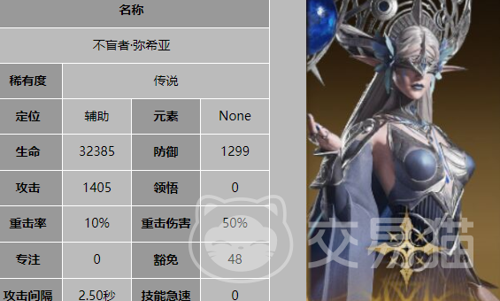 不盲者弥希亚以其强大的治疗能力被誉为游戏中最强的奶妈英雄。她的一技能生命光环可以直接提升队友30%的生命值,无需任何前置条件;星月垂怜则能在队友受到致命伤害时施加不死状态并恢复血量,远程队友还能获得隐身效果;长生之辉是范围性的 治疗技能,能为全体队友恢复血量;全知者祝佑更是拥有复活效果,能复活所有己方单位并恢复75%的生命值。这些技能使得弥希亚在团队中扮演着不可或缺的角色,无论是推图还是竞技场,她都是保障队伍生存能力的关键,但是这个技能的耗蓝比较多,前期如果获得还是推荐优先培养的。