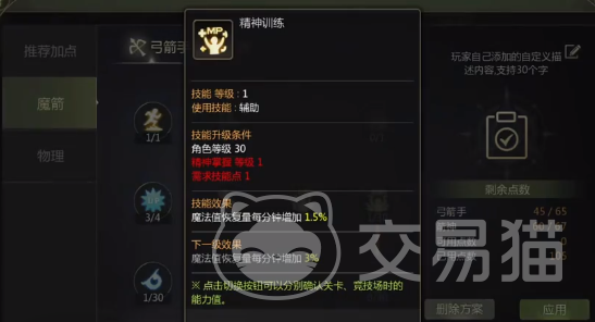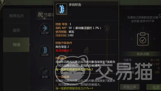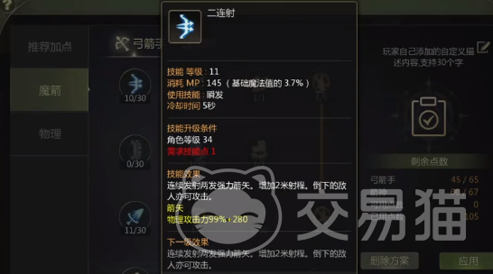 魔法箭神加点二联社可以直接加到10点,另外必须要点满魔法剑士。鹦鹉也需要点到三级,剑神这一边就可以集中选择射击或者是飞空连射,各自加点6个。飞空连射是非常重要的,拥有比较高的伤害,可以带来源源不断的输出。