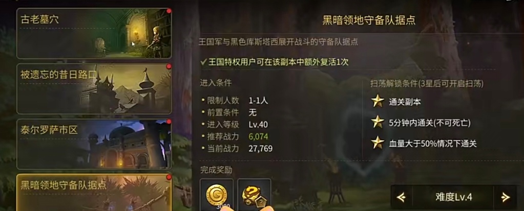 介绍完资源副本以后,下面就是获得金币的副本了,金币副本每天可以挑战3次,这种副本只有在当天把三次机会全部都打完,次日才会刷新,若打不完就只不会刷新,为此大家最好每天都把金币副本给打完了。