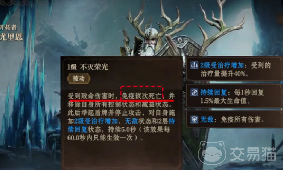 说到尤里恩这个角色,他在战斗的时候如果受到了致命的伤害,而他的被动技能可以让他免疫该次死亡,并且能够移除自身所有的控制。其实正是因为他的这个被动技能,能够让他在战斗的过程当中获得特别高的生存能力,简单来说就是他的这个技能能够让他在关键的时候免于死亡。
