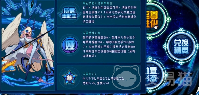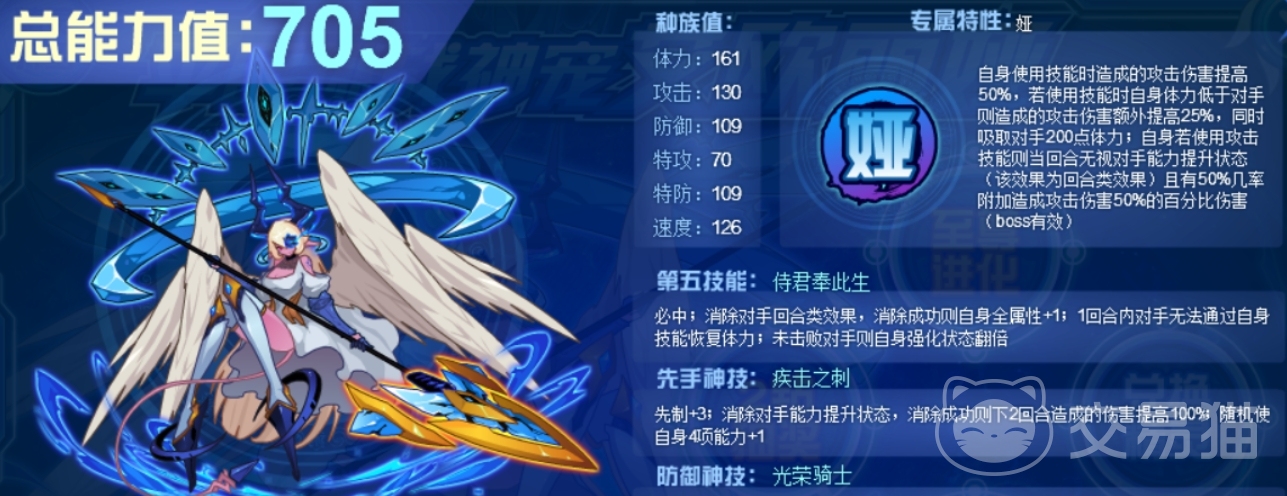 自然祝福技能它可以使自身全属性+1,如果当前体力低于对手,则提升效果会翻倍,接下来的4回合内,每回合都能够恢复自身最大体力的1/3,当自身体力低于一半时,这个技能甚至可以直接将体力回满,破敌冰锥击技能也是必中的,它有25%的几率使伤害变为原来的4倍,如果未能触发这个效果,则会附加300点固定伤害,待君天尽头技能它可以消除对手的回合类效果,当成功消除对手的回合类效果时,自身全属性会+1,如果在未击败对手的情况下使用了这个技能,则下2回合的攻击必定致命一击。