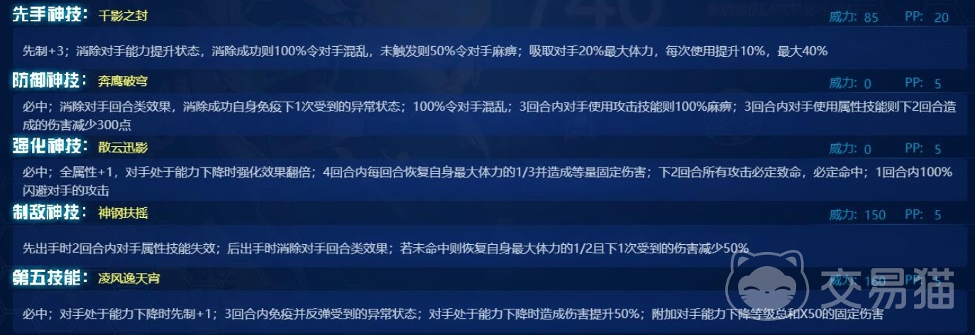 第五技能凌风逸天宵则是杰特洛的终极绝技,它必定命中当对手处于能力下降状态时,杰特洛会获得先制+1的优势,能够在对手行动之前发动攻击,在3回合内免疫并反弹受到的异常状态,让敌人的负面技能无法对它造成伤害,反而还会反弹回去,当对手处于能力下降状态时,造成的伤害会提升50%,此外还会附加对手能力下降等级总和乘以50的固定伤害。