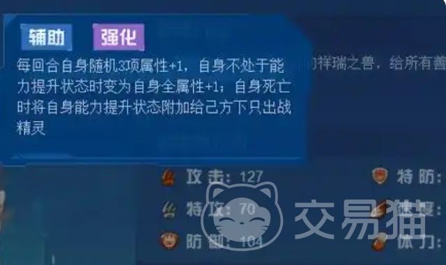 福兽天禄在每回合自身会有随机3项属性加1,当它自身不处于能力提升状态时,就会转变为全属性加1,并且当福兽天禄死亡时,会将自己所拥有的能力提升状态传递给己方下一只出战的精灵,在招式推荐搭配方面,天福临门、天辉福灵光、天赐福缘以及瑞兽临世这几个招式加成不错,其实这个精灵它常常与鲁肃一起被人们拿来对比,这两只精灵存在一个共同特性,那就是在它们死亡之后,能够将自己的强化效果转移给下一只精灵。