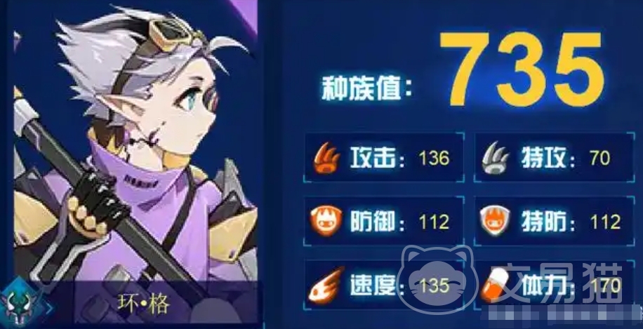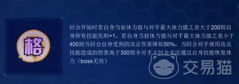 环格136点的攻击属性显得有些偏低,140点可能更为合适,速度属性则过高,而双防属性还算可以,在战斗回合开始时,如果环格的当前体力值与对手的最大体力值之差大于200点,那么它自身所有的技能都会先制+1,如果环格的当前体力值与对手的最大体力值之差小于400点,那么当回合它受到的攻击伤害会降低50%,当回合如果对手使用攻击技能造成的伤害高于300点,那么对手在下回合将无法通过自身技能恢复体力,但这个效果对BOSS无效。