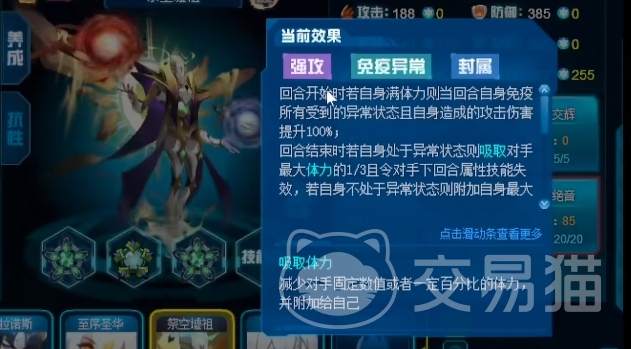 神像化墟是一个非常实用的技能,可以在先出手时100%使对手疲惫,如果未触发疲惫效果,那么在接下来的两回合内,自身将获得先制+1的优势,而在后出手时,这个技能可以恢复自身最大体力的一半,并同时给对手造成等量的固定伤害,因此大家可以考虑将其作为配招之一,光陨荒芜祭是第五技能,同样具有必中的特点,使用后可以消除对手的回合类效果,如果消除成功,则下一次受到的伤害会转化为自身的体力,如果没有击败对手,还会附加对手双防之和40%的固定伤害,而当击败对手时,则可以吸取对手下一只出场精灵最大体力的三分之一数值哦。