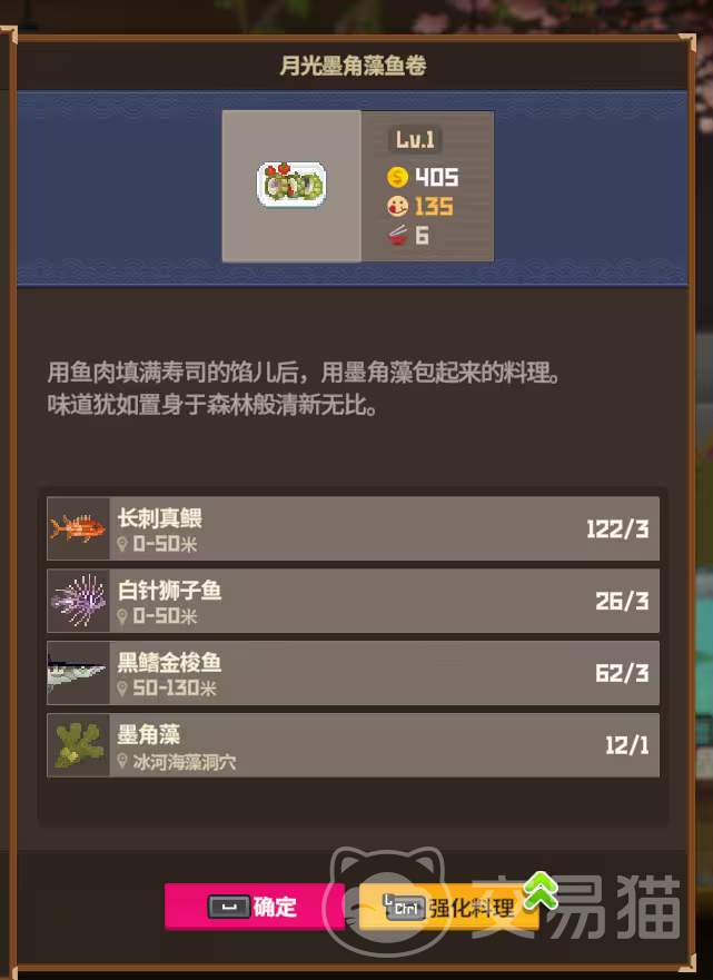月光墨角藻鱼卷是秘密菜谱中的一道高人气菜品。这款料理以墨角藻为主要材料,而墨角藻只有在触发“海藻洞穴”任务后才能采集。由于墨角藻的数量较为稀少,制作这道料理需要玩家规划好采集的时间和区域。尽管墨角藻的获取难度较高,但这道菜的收益和评价较为可观,是玩家提升寿司店评价的优质选择。