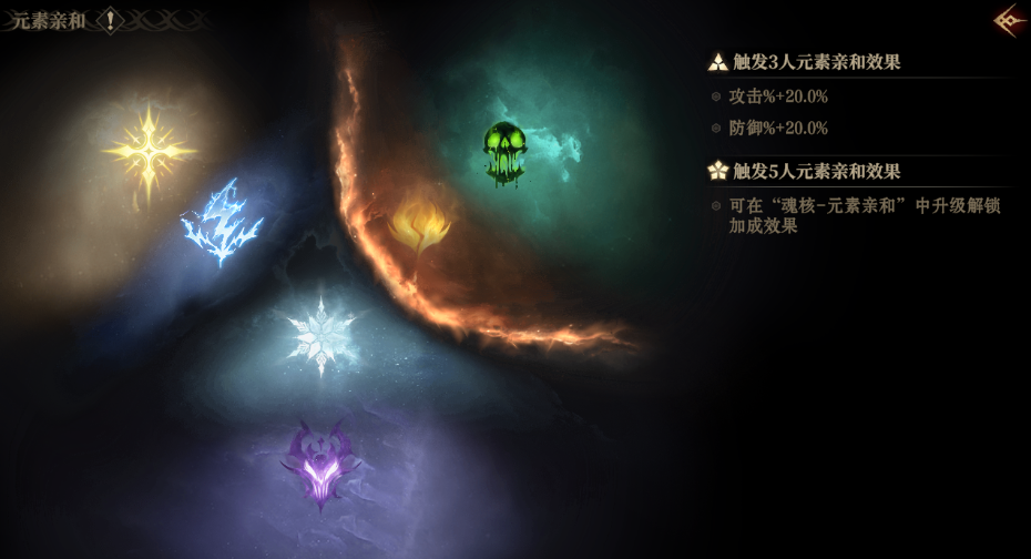 而上阵的时候需要5名英雄同组元素的数量达到3或者是5的时候就会触发元素亲和的效果。简单来说就是这时候已经激发了对应的元素亲和。如果玩家想要触发哪一组的元素亲和,那么至少要派三个或者是5个对应阵营的英雄。举个简单的例子,如果玩家想要让火焰和毒素阵营的元素亲和发动的话,那么玩家所派上场的队伍至少有三个火焰或者是毒素属性的英雄。