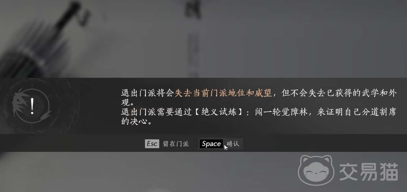 但要注意退出门派是需要人们付出点代价的,有的门派会要求玩家们去进行闯关,只要胜利了就能直接离开门派,而有的门派则需要玩家们交足一定数额的游戏货币,然后就会放玩家离开。相应的退派任务都会在点开叛逃师门的选项后提示玩家,若自己已经下定决心要离开门派,可直接点确定就能接下该任务,但要注意若自己之前退出过该们,再退出时需要等待一段时间。