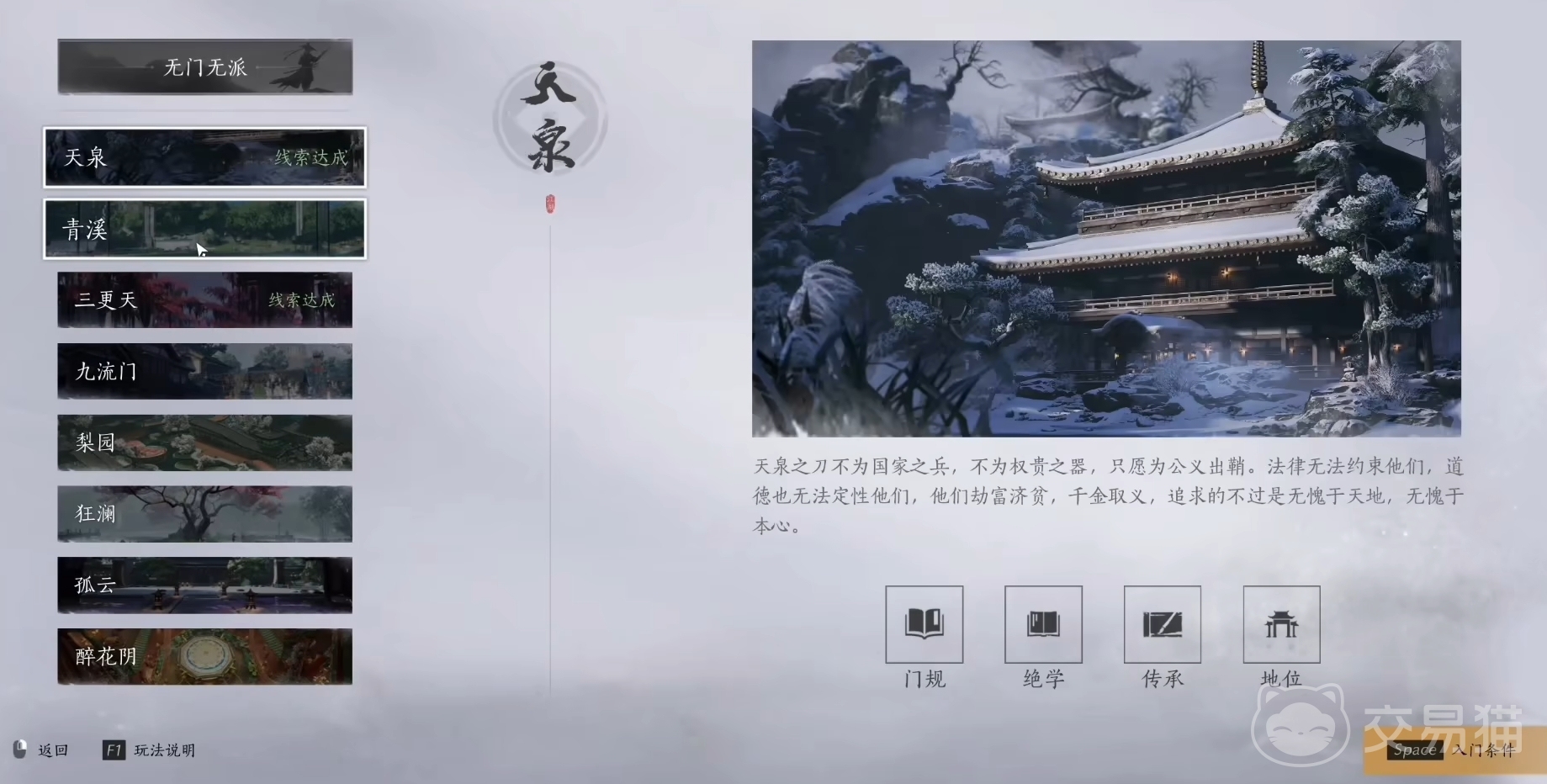 当玩家达成了退门派的任务要求后,再次点开门派界面,那么原本的门派名又会改为无门无派,此时玩家可继续查看各门派的加入线索,并挑选一个自己所喜欢的门派加入,也可继续做一段时间无门无派的侠客,等自己想加入时再去进行入门任务。