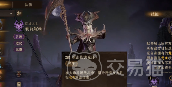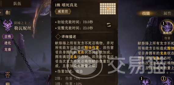 定位于传说级别的召唤英雄,一个队长技能就可以有效提升所有有方目标45%的伤害,被动技能龙神血脉可以减少自身30%的伤害。如果场上有任意一个目标死亡,那么自己就可以得到龙血状态,并且这一个状态在持续期间没有办法移除。可以获得1.5%的重击伤害。