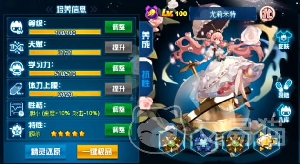 此外缭乱作为先手技能,也是尤莉米特必备的技能之一,它具备先制吸强封攻击的能力,并辅以魂印效果,使得对方在使用属性技能命中时能够恢复生命值,繁星赞美诗则是尤莉米特的主要输出技能,它不仅具备高伤害还是必中的,这个技能需要注意的是未击败下回合先制+2的效果,搭配强化技能使用时,能够叠出一回合先4的高额伤害,这种设计让尤莉米特在面对敌方先手控制时,能够迅速反击并重创对手。