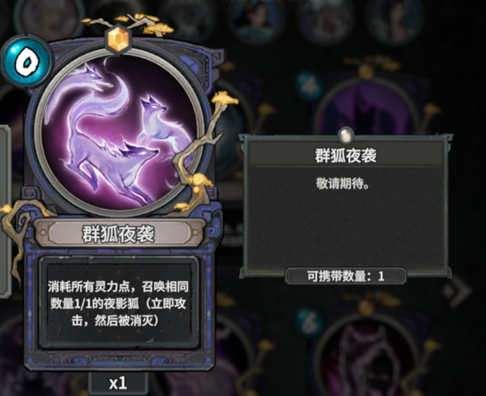 第一张“狐群夜袭”,消耗所有灵力点,召唤相同数量的夜影狐立刻攻击敌人,分散敌人打击,卡牌稍微显得弱势,但是初期来了也是可以使用的;第二张“属性汲取”,这张卡牌相当不错,能将一个敌方召唤物的属性值降低到1点,随机使我方一个召唤物获得其降低的属性值。