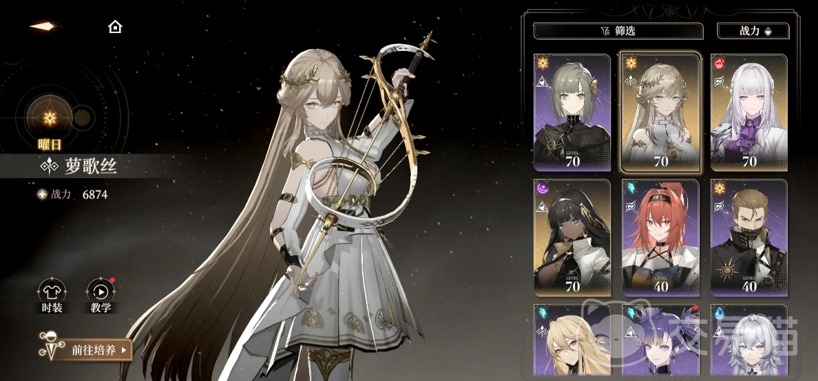 萝歌丝也是一位SSR角色,攻击力达到100,生命上限为1575,她是神谕隐所百年来最年轻的成员。萝歌丝的普攻分为四段,第四段击中敌人后会获得音符,终结技在释放后,会挥舞手中的剑连续进行穿刺,对敌人造成连续伤害。此外,当队伍中有音符且队友的生命值超过80%时,终结技还会为整个队伍提高10%的伤害输出。