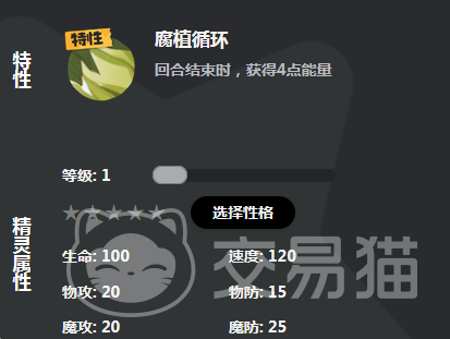 伊贝粉粉的特性是腐植循环,在回合结束时能获得4点能量。种族值之和为606,在具体属性方面,生命值明显高出一档为150点,这也是众多精灵中比较出色的一项属性了。其余的属性就比较低,物防和魔防还算出色都为100点左右。它是由伊贝尔进化而来的宠物,在战斗中有哪些技能一起往下看。