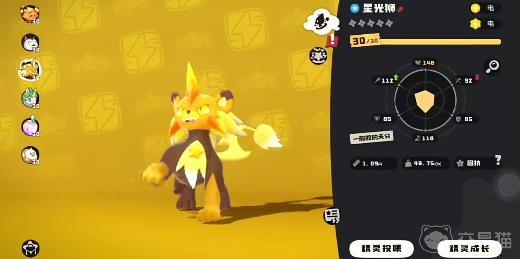星光狮的种族值和高达641点,其中物攻和魔攻这两项属性都是115点,速度更是高达135点,虽然还不是游戏中速度最高的,但是已经超过了大多数宠物。特性是电流刺激,每携带一个光系技能,入场效果延长一回合,这就意味着在入场的时候尽量多的携带光系技能,这样才能尽量好的利用特性。
