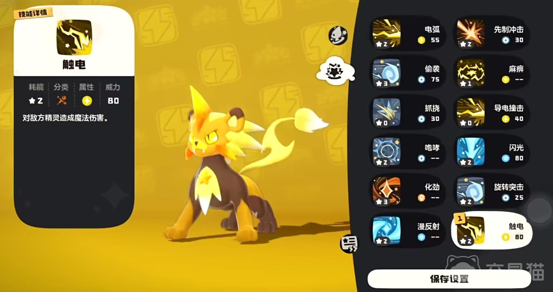 在魔法攻击方面,主要技能包括落雷,造成魔伤,每次进场威力增加20点。引雷,造成魔法伤害,二连击效果,在进场之后的首个回合威力提高15点。逆光,造成魔伤,每携带一个不同系别的技能,本技能威力就能增加20点。闪光,对敌方精灵造成魔法伤害。物攻技能主要有乘胜追击,造成物伤,1连击,在每次释放后,连击数加1。飞速旋转,造成物理伤害,进场的首个回合威力增加30,先手增加1点。无影脚,造成物伤,应对时威力增加100%,应对的是状态技能。旋转突击,造成物伤,3连击。