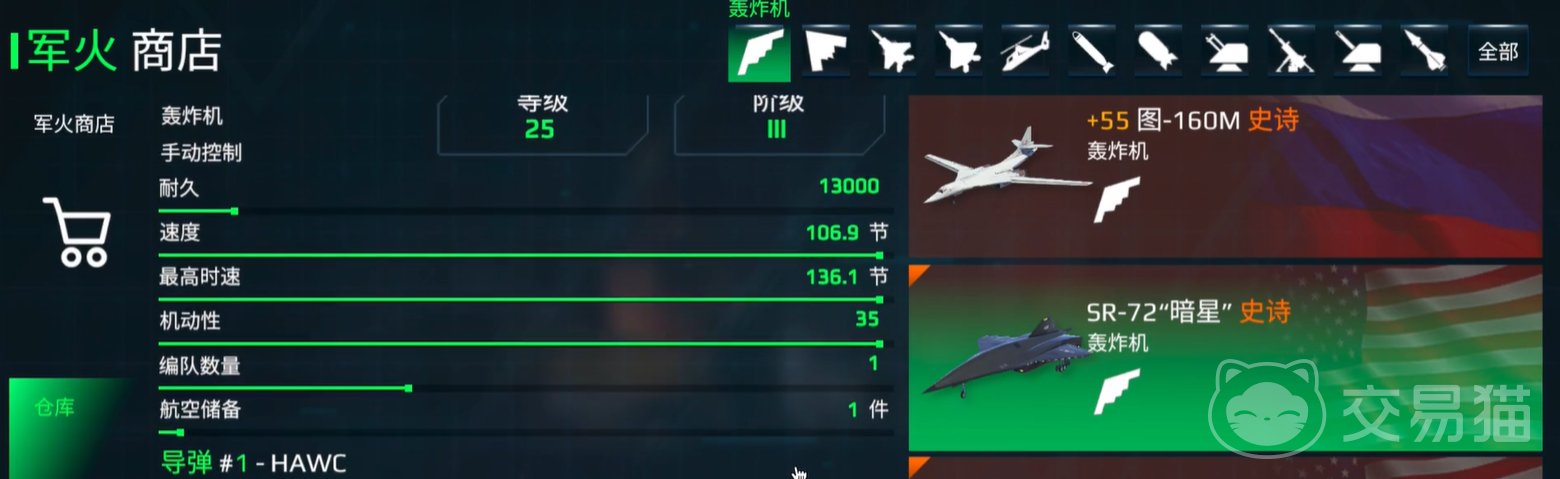 暗星SR-72轰炸机支持手动控制,它各方面数据都不错,耐久度甚至达到了13000,最高时速达到136.1节,速度为106.9节,机动性为35,编队数量为1,航空储备1件。它诞生于空射高超音速巡航导弹项目,在2021年下半年进行第一次试飞。它等级为25级,阶段为3。