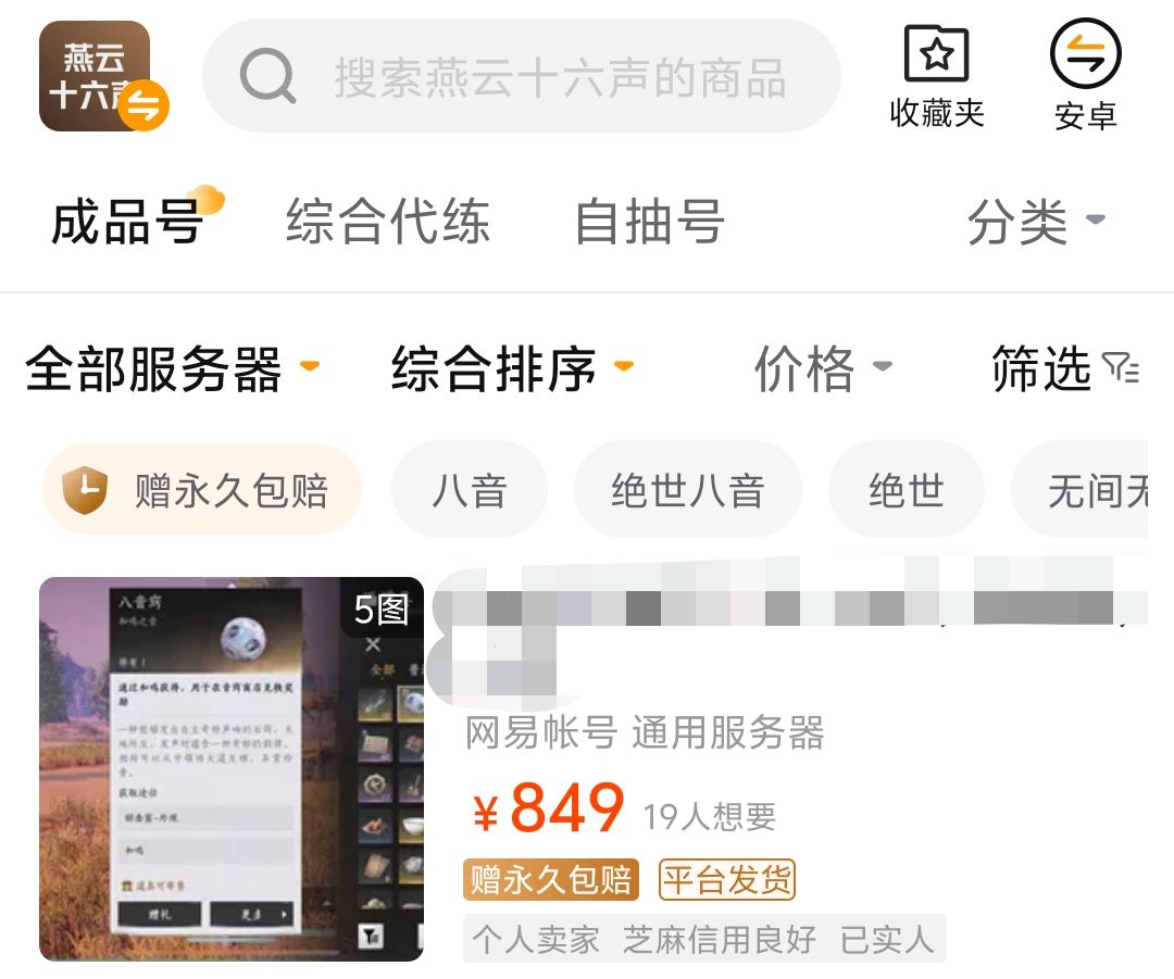 关于燕云十六声账号交易平台推荐目前就给大家介绍到这里了,在这里无论是想要八音翘、无见无相以及万剑归宗等等道具的账号都能够通过筛选等关键词来搜索到,不想直接在自己账号中氪金但是又羡慕其他玩家有着超级豪华坐骑以及套装的玩家就赶快下载试试吧。