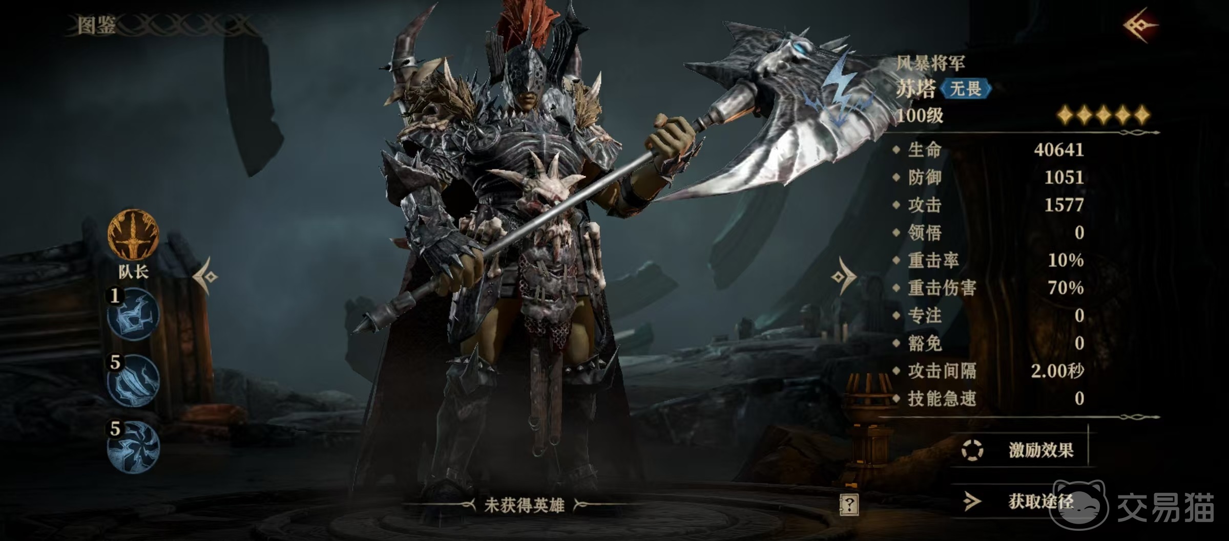 第3个推荐的是纳斯捷卡,被动黑羽,每存活三秒钟,自身就能获得一层状态,持续时间无限,无法被移除,自身会根据攻击速度额外获得重击率,每一层状态能提升5%攻击速度。技能利爪,瞬移到当前血量最低的敌方目标,造成三次闪电伤害,视为普通攻击,在战斗开始时必定会释放。大招对范围内敌方目标造成闪电伤害,随后10秒内,友方目标对任意敌方目标进行普攻时,自身都有几率射出羽毛附加追加攻击,无畏英雄有双倍几率触发该效果,追加攻击同样被视为普通攻击。第4个推荐的是风暴将军苏塔,它的被动是对目标触发重击时,会产生幻影,幻影对目标发动追加攻击,追加攻击视为普通攻击。战技能斩甲劈砍,发动二连斩造成闪电伤害,有几率额外触发重击。大招巨力肢解,挥舞的大斧冲锋,对目标发动5次攻击。有额外几率触发重击,被该技能击杀的敌方目标无法被复活。
