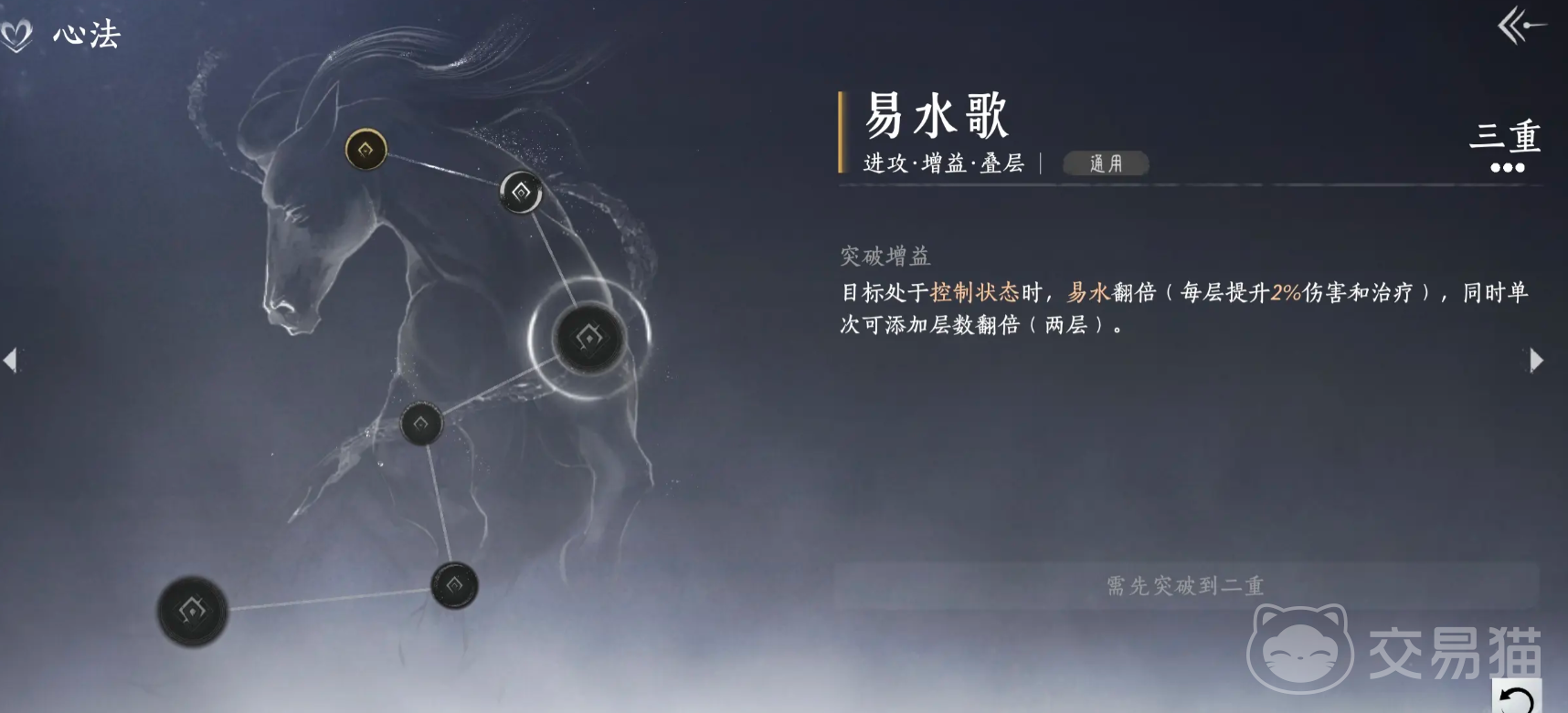 还有就是心法选择方面,分为核心心法以及辅助心法,”威猛歌”就是陌刀的核心心法,能够显著的提高蓄力以及会意的伤害;辅助的心法可以选择能提供额外防御能力的,比如抗造心法,“易水歌”以及“四时心法”都能加快蓄力的速度,提高伤害。