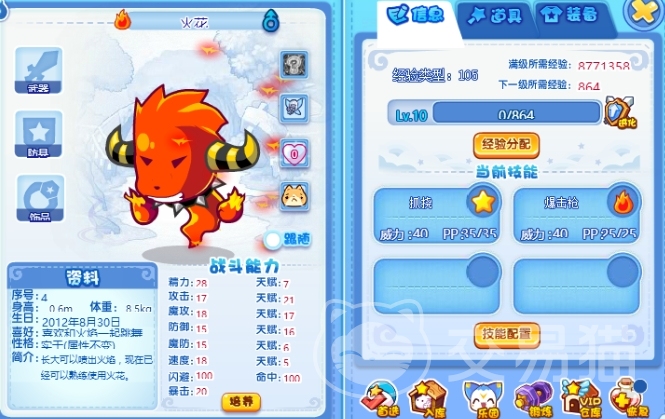 火花属于火属性精灵,其助燃特性可以大幅度增强技能的攻击效果,特别适合追求高伤害输出的玩家。火系攻击不仅威力强大,还能对水系和虫系敌人造成额外伤害。进化成豪炎战神后,火花不仅在外形上变得更加威猛,其技能也得到了质的飞跃,如抓挠技能可以多段攻击敌人,连续攻击则能在短时间内施放多次技能,而火焰冲击更是能够对单个敌人造成巨大伤害。