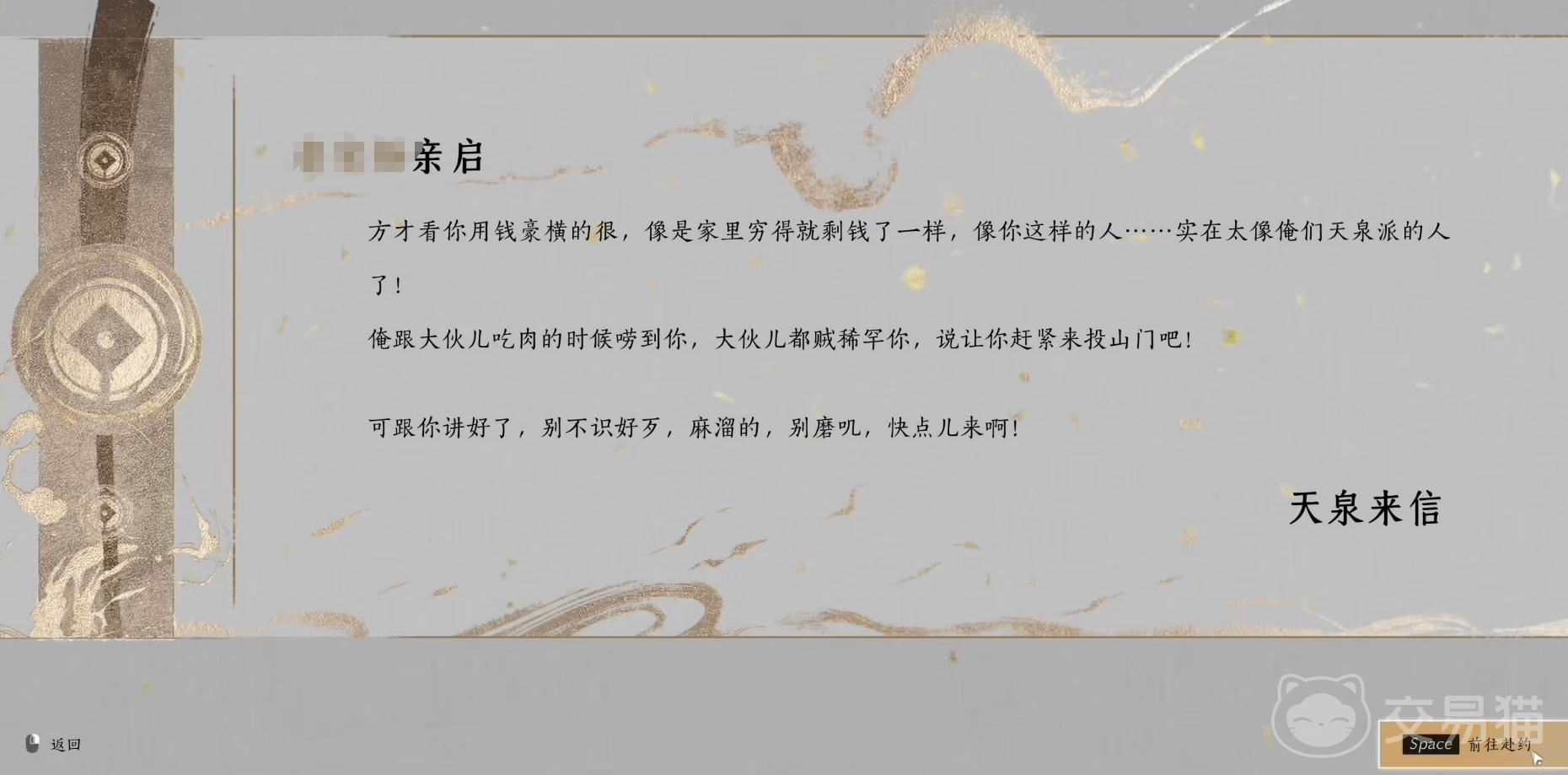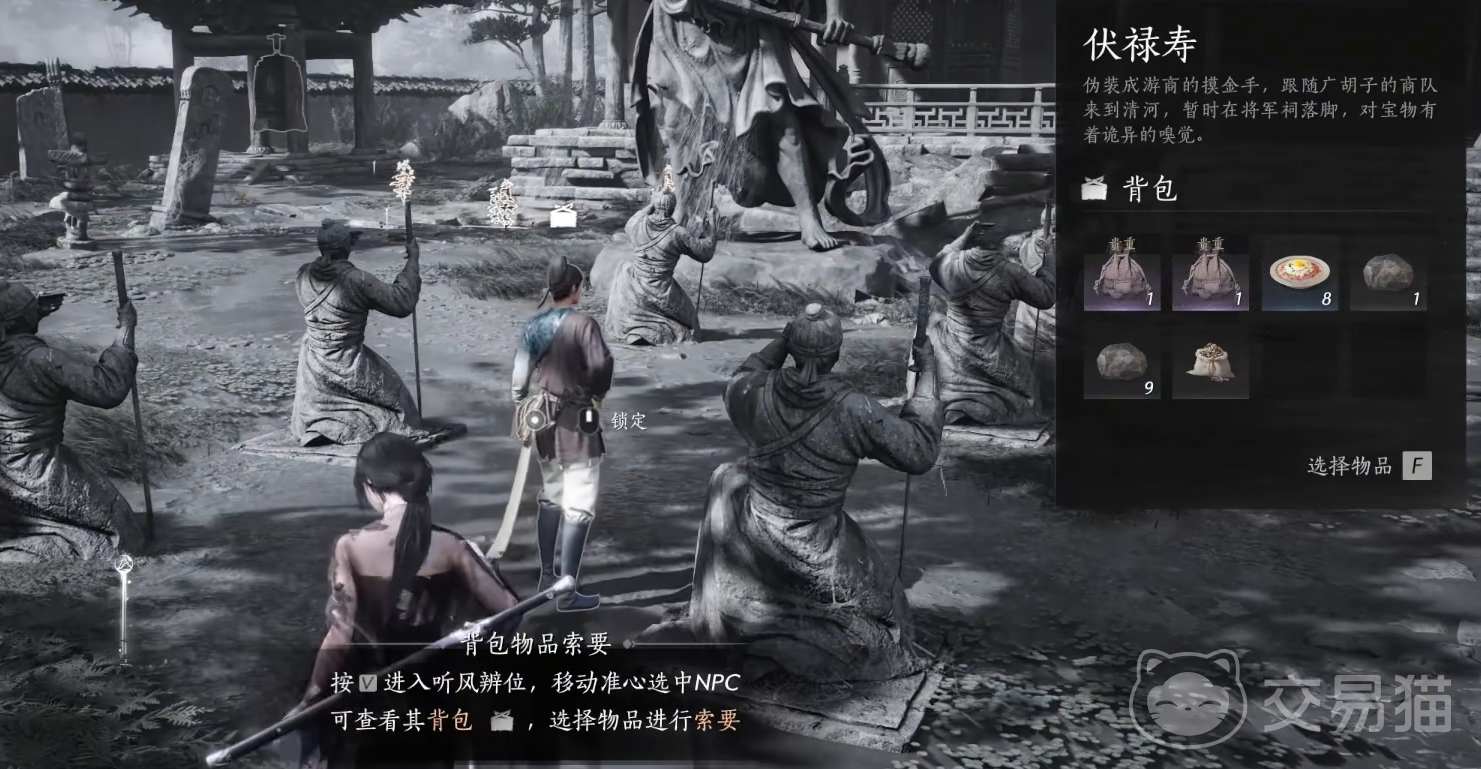 首先,大伙可先前往将军祠,在白天的时候找到伏禄寿,用听风辩位后选定他,就能问他要不义之财了,共能要两个。接着可前往神仙渡找商人郝久,将他那里的酒全部买下并喝掉,就有概率获得不义之财。也能去不伏马场找从不问,他身上也有两个。只要拿到三个就能回去找张一豪进天泉了。