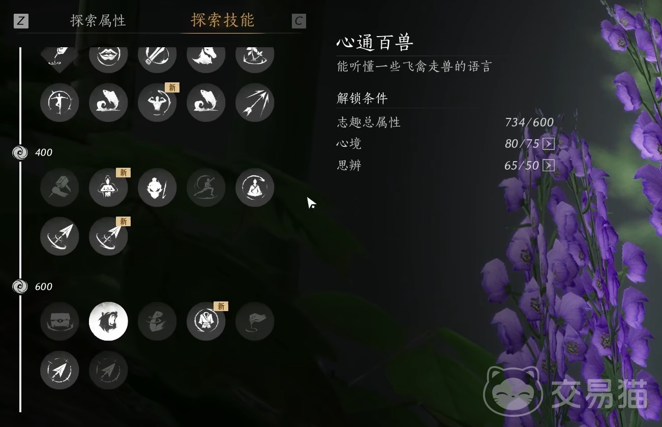 心通百兽的解锁方法也比较的简单,只要玩家的志趣属性达到600,且心境和思辨属性分别达到75和50,那么心通百兽就能自动解锁。若是其中某项属性没能达到要求,各位可直接点开该属性,并通过里边的提升途径去进行针对性的提升,直至三项属性都满足要求即可。