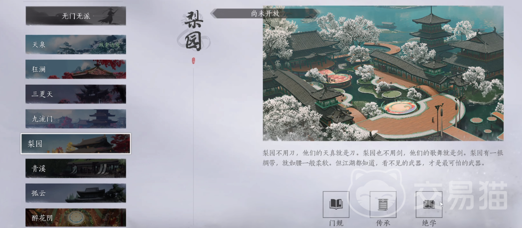 梨园门派相较于醉花阴门派来看是比较小的一个门派,不过它对于弟子的要求却是要更高一些,加入梨园需要玩家完成他发布的宗门任务。玩家只要在规定的时间之内完成就可以加入梨园了。梨园最为擅长的是游戏中的轻功,传闻梨园老祖飞花摘叶之间便能消失的无影无踪。在梨园门派玩家将有机会学习到高深莫测的轻功以及中等的江湖武术。