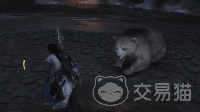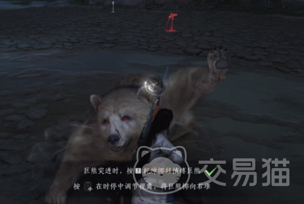 沿着通道前进,你最终会来到一个阴暗的洞窟。在这里,一只强大的厚皮白化黑熊正在等着你。这时候需要用到刚刚学到的乾坤挪移技能。要想打倒这只黑熊,你必须将它摔到地上的石块上,这样才能有效伤害它。