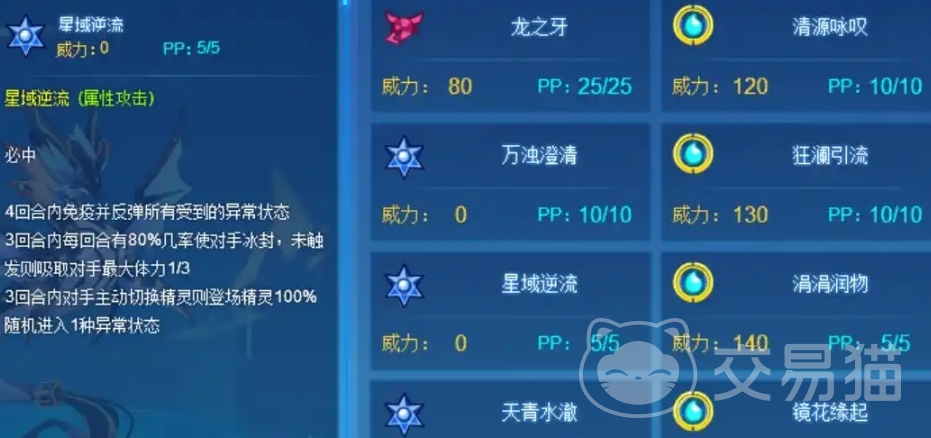 星域逆流的技能机制也是不错的,因为其魂印效果为4回合的基本弹控,在3回合内,每回合有高达 80%的几率使对手冰封,这一几率使得对手在面对星域逆流时,行动极大地受到限制,几乎难以逃脱冰封的命运,倘若冰封效果未能触发,它还能够吸取对手最大体力的1/3,在这3回合内如果对手主动切换精灵,那么登场精灵将有100%的概率随机进入1种异常状态。