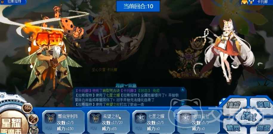 再借助绿火的特性,就可以在速度上快过boss,龙娘的配置在战斗中要努力打出 150 的伤害量,如果幸运地触发了翻倍伤害,那么就有很大的机会直接击杀卡托娜,要是没有触发翻倍,也不用担心,让两只备用的精灵使用先三补刀技能即可完成击杀,为了确保战斗的稳定性还可以适当压体,降低自身的血量,以提高触发一些特殊效果的概率。
