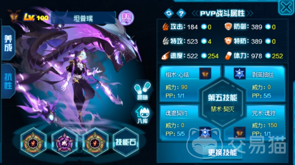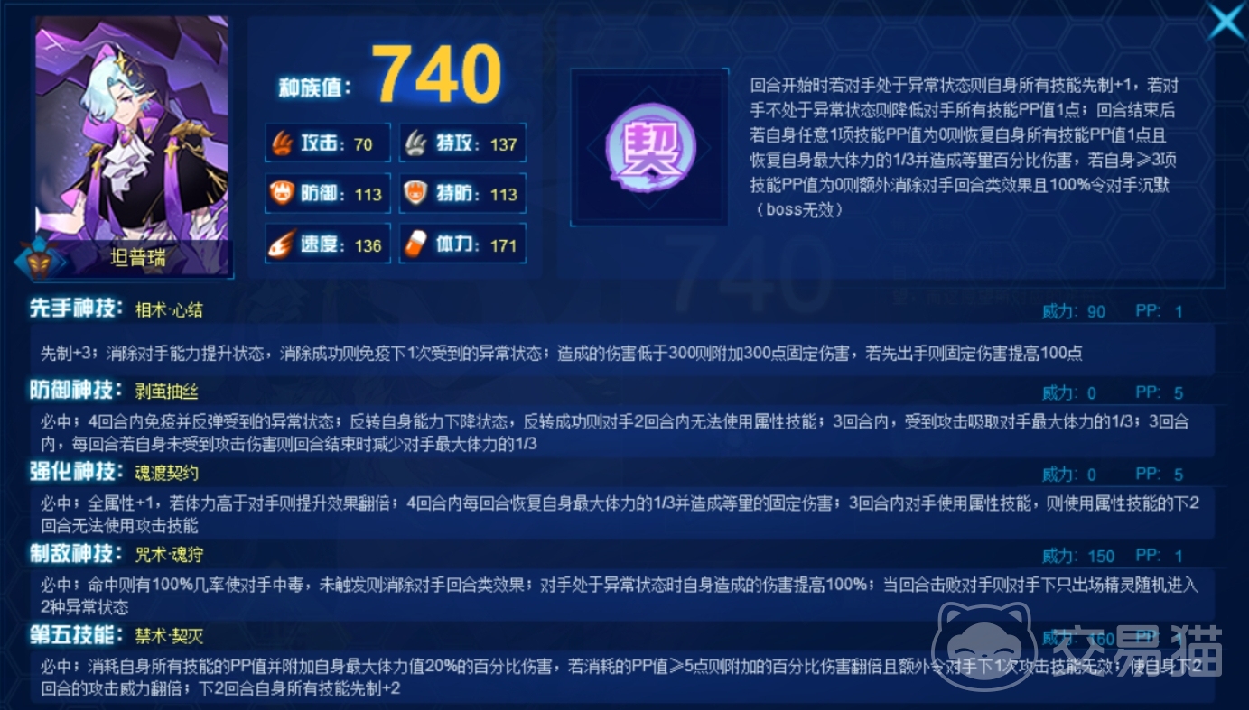 强化属性魂渡契约可以让全属性+1,若体力高于对手则提升效果翻倍,171的种族值很适合这一效果,可节制很少用到强化技能,其二4回合内每回合恢复1/3体力值,并造成等量的固定伤害,虽然是吃月亮的百分比伤害,魂印自带的吃月亮可在一定程度上弥补没有低体翻倍的不足,3回合内对手使用属性技能,则使用属性技能的下2回合无法使用攻击技能。