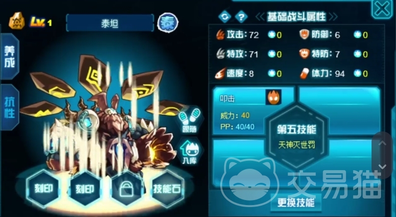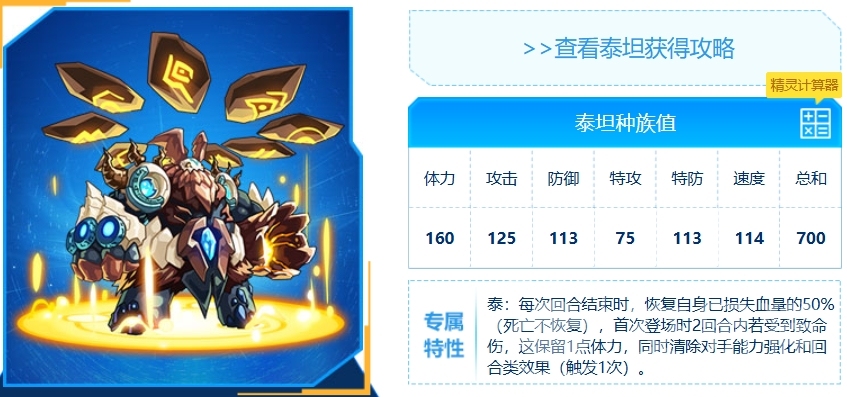 但是他的特性效果还是有一定的实力的,每这个效果就是在每次回合结束时,它能够恢复自身已损失血量的50%,不过若已死亡则不会恢复,并且首次登场时若在2回合内受到致命伤害,它会自动保留1点体力,同时还能清除对手的能力强化状态以及回合类效果,此特性触发机会仅有1次,这一特性让泰坦在战斗中拥有了极强的生存能力和应对突发状况的能力。