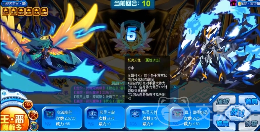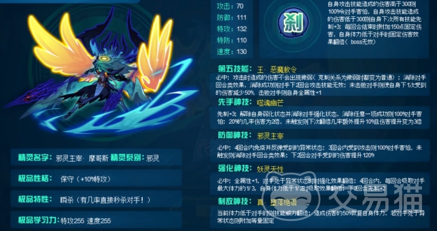 在原技能基础上威力增加到了150并增加了新的效果,从这些改动可以看出策划试图将邪灵王往PVP方向转变,妖灵天性技能属于标准的公式型强化技能,集强化、吸血与先制于一体,邪灵主宰技能的干扰效果是让对手在接下来的三回合受攻击时陷入害怕状态,当与魂印先制配合时,玩家可以预判对手的攻击,先手释放该技能来控制对手,从而达到干扰对方节奏的目的,然而其增伤效果虽然能提升 120%的伤害,但由于本身未绑定先制,这使得增伤的实用性大打折扣。