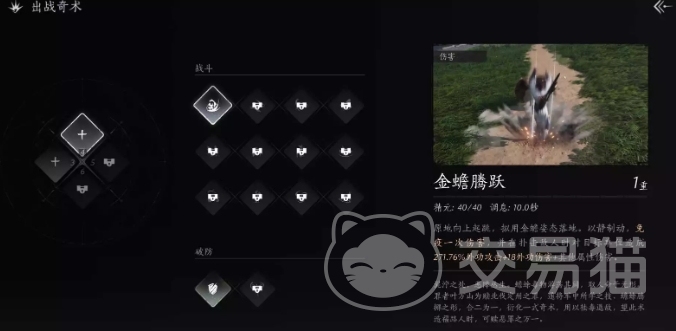 金蟾腾跃其特点是原地向上跃起,以传说中的金蟾姿态重重落地,此时可以免除一次即将受到的伤害,并在下一次受攻时自动发动反击,造成271%的外功攻击力加上42点固定外功伤害。