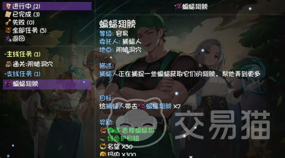 第二层名为阴暗洞穴,而在这个任务当中最核心的就是拿到蝙蝠翅膀这个重要的材料,而要想开启任务内容是需要先到地下洞穴中找到捕蝠人这个NPC角色,并与他完成对话,选择接受任务则可以也开始相关的任务内容,而不服人之所以捕捉蝙蝠,是因为它想获得以蝙蝠翅膀制作的一道美味,而且在玩家接受这个任务后还可以获得相应的报酬奖励,为后期的其他任务做好铺垫。